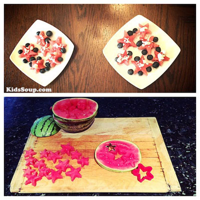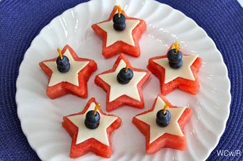 Watermelon, cheese, and blueberries appetizers from cookingwithruthie.com