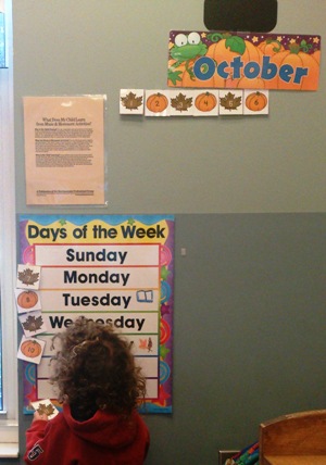 We used both the KidsSoup Resource Library's pumpkin and the leaf calendar numbers for our October calendar. Each day during our morning meeting, we choose a child to be our calendar helper. This child has the responsibility of placing the day’s number on the calendar. As a group, we review the name of the month, the day of the week, what the next number will be, and which image we will need. We emphasize that we are adding 1 more day to our calendar by counting the number of cards we have hanging before and after determining the date.