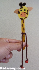 With the brown marker, draw spots on the craft stick and on the giraffe's face. Glue face on top of craft stick. Hold the craft stick giraffe and twirl to make the giraffe dance.