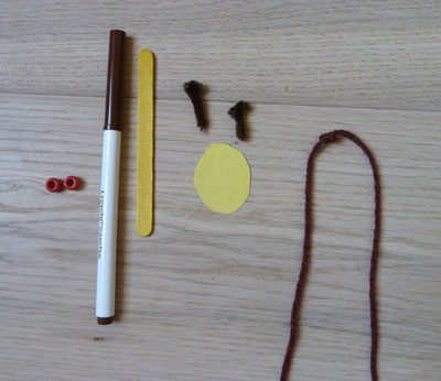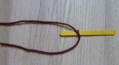 Tie brown yarn around craft stick. Attach a bead to each end of the yarn.
