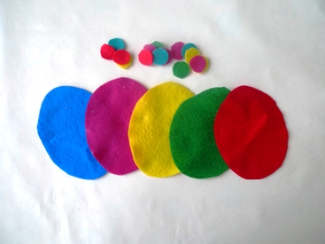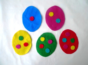 Draw an egg shape onto blue, pink, yellow, green, and red felt. Cut out each egg. Trace 15 dots onto the remaining felt scraps and cut out each dot. Glue one polka-dot to the blue egg, two polka-dots to the pink egg, three polka dots to the yellow egg, four polka-dots to the green egg, and five polka-dots to the red egg. Attach magnet strips or Velcro dots to the backs of the eggs. Print the Number Cards onto white card stock, laminate if desired, and cut out.
