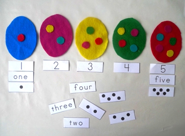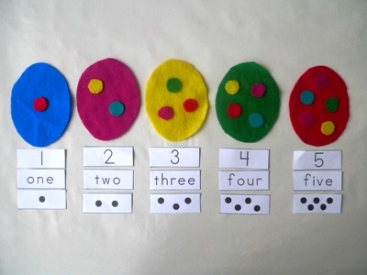 Place the felt pieces and number cards in a small container (a small Easter basket is one possiblity) and encourage children to use the activity to practice counting and identifying number amounts. Children can count the polka-dots on the eggs and place the eggs in sequential order from 1-5. Then, they can find the matching number, number word, and number dot cards and place them under each egg.
