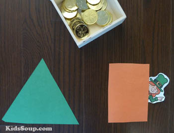 Place 8-10 gold coins or beans (spray painted gold) inside a small container. Place the shapes in the middle of the table. Taking turns each player gets to hide the leprechaun under a shape while the other children are turning away from the table. Each player get's one try to find the leprechaun by naming a shape and lifting it up. If the player finds the leprechaun, he/she gets a gold coin/bean. Continue until there are no more gold coins in the container. The player with the most gold coins wins the game.