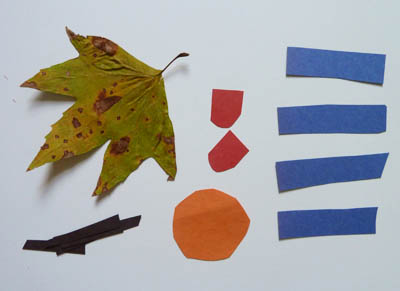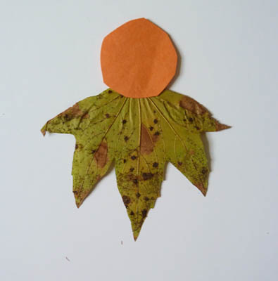 Let children choose a pressed leaf. Hand out craft paper and let children cut long rectangles for the arms and legs, a large circle for the head, and two small circles for the arms.