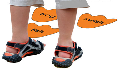 Encourage them to whisper each rhyming word pair as they place their feet on the corresponding duck footprints.