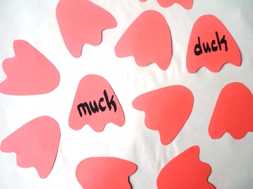 Print and cut out the Large Duck Footprint. Trace several footprints onto orange construction paper or craft foam. Write rhyming word pairs on the footprints, one word per foot. Tape the footprints across a large area, making sure to place rhyming word pairs together.