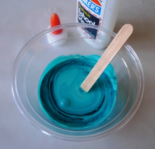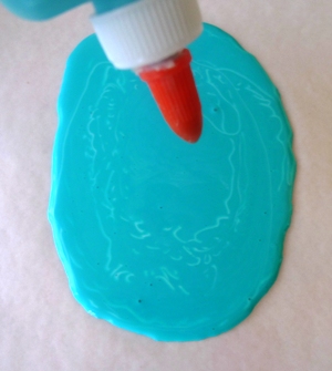 Show children how to squeeze blue glue onto the center sections of their wax paper squares by making the O shape over and over from the outside to the inside until they have large solid ovals.