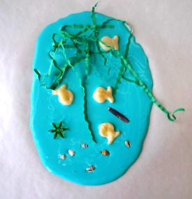 Then, have children press shredded green paper, small shells, goldfish crackers, fish shapes, and/or beads into the glue to make ocean scenes.