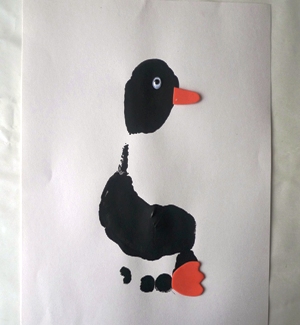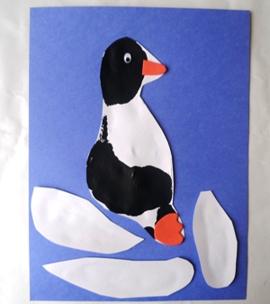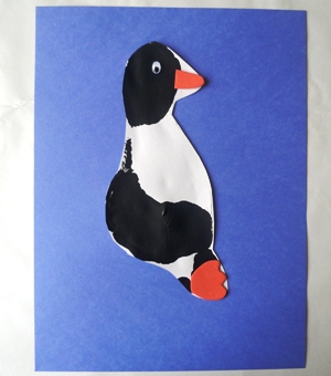 Have children draw lines from their penguins' heads to where the black paint begins again to make the white bellies of their penguins. Show them how to cut out their penguins by cutting around their foot shapes. Have children glue their penguin cut-outs to blue construction paper backgrounds.