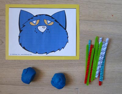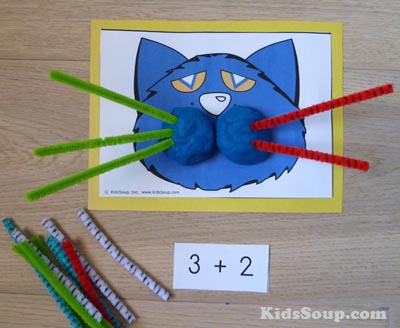 Print Pete the Cat Face and Addition Cards and cut out. Glue the Pete the Cat face on a piece of craft paper and laminate for extra strength. Cut the pipe cleaners in to three pieces. Place the pipe cleaners and the play dough in small containers.
