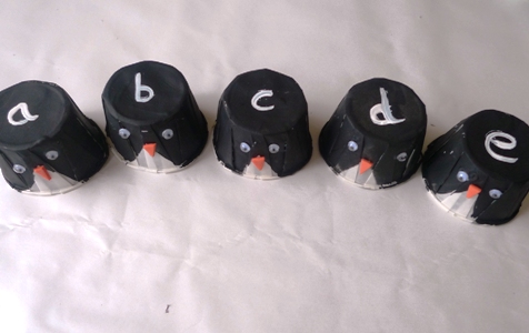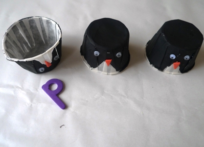 In this game, one player hides the letter P under one of three penguin sample cups. Then, he/she moves the cups around without exposing the letter. The other players try to follow the movements of the cups in order to guess where the cup hiding the P lands. Game can be played with other letters and/or numbers as well.