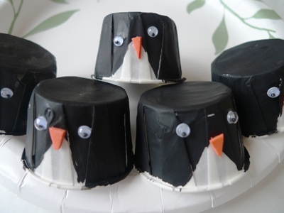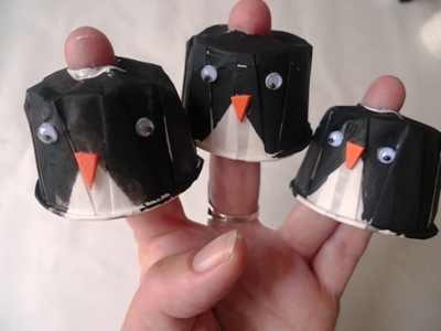 Cut holes in the tops of the penguin sample cups to make finger puppets. Use the puppets as props when reciting related rhymes. Only three are needed for the rhyme below.