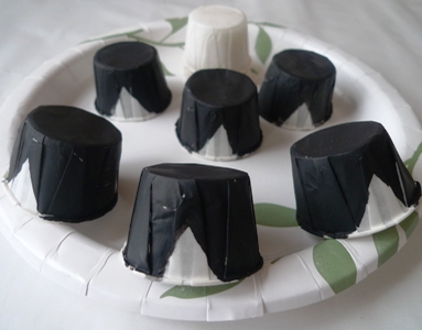 Paint sample cups black, leaving small traingles of white showing for the penguins' bellies.