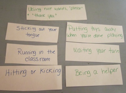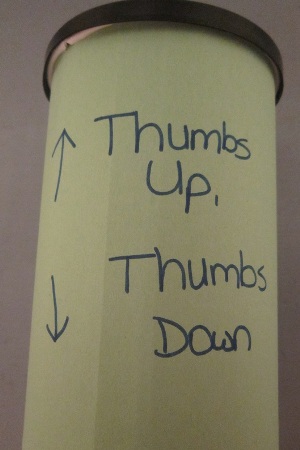 Follow the happy face/sad face graphing activity with a “Thumbs-Up, Thumbs-Down” game that extends learning about school manners by discussing additional behaviors that apply to your classroom. Cover a clean, empty coffee can with construction paper and write the words “Thumbs-Up, Thumbs-Down” on the front.