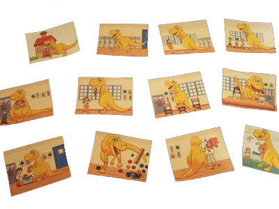 Once children have had an opportunity to hear the Rowdy-osaur felt story a few times and play with their puppets, introduce the Rowdy-osaur School Manners Game Cards with the Happy and Sad Faces. Prior to beginning the activity, laminate the faces and attach craft sticks to the backs with tape. If needed, prepare additional faces so that each child has one happy and one sad face. One-at-a-time, hold up each card featuring one of Rowdy-osaur’s behaviors. If the behavior is positive, children hold up a happy face. If the behavior is negative, children hold up a sad face.