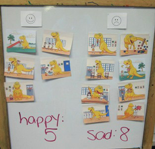 Extend the lesson by attaching one happy face and one sad face to an easel. Have children place the Rowdy-osaur School Manners Game Cards in the correct sections on the easel. When all of the cards have been placed, have children count how many cards are in the happy face section and how many are in the sad face section. Ask questions such as “Which section has the most and which has the least?”